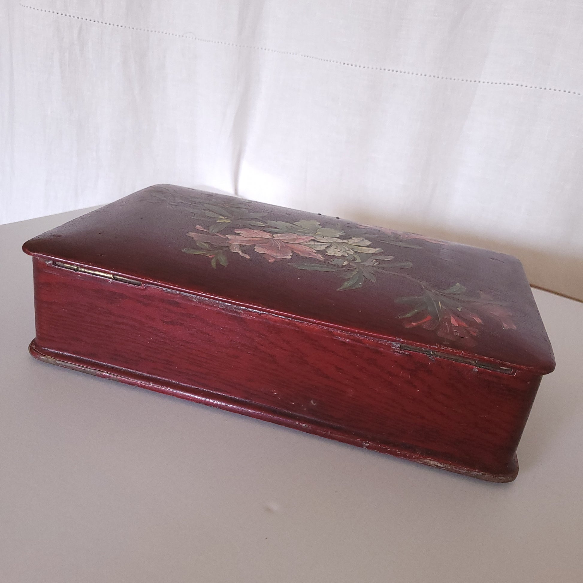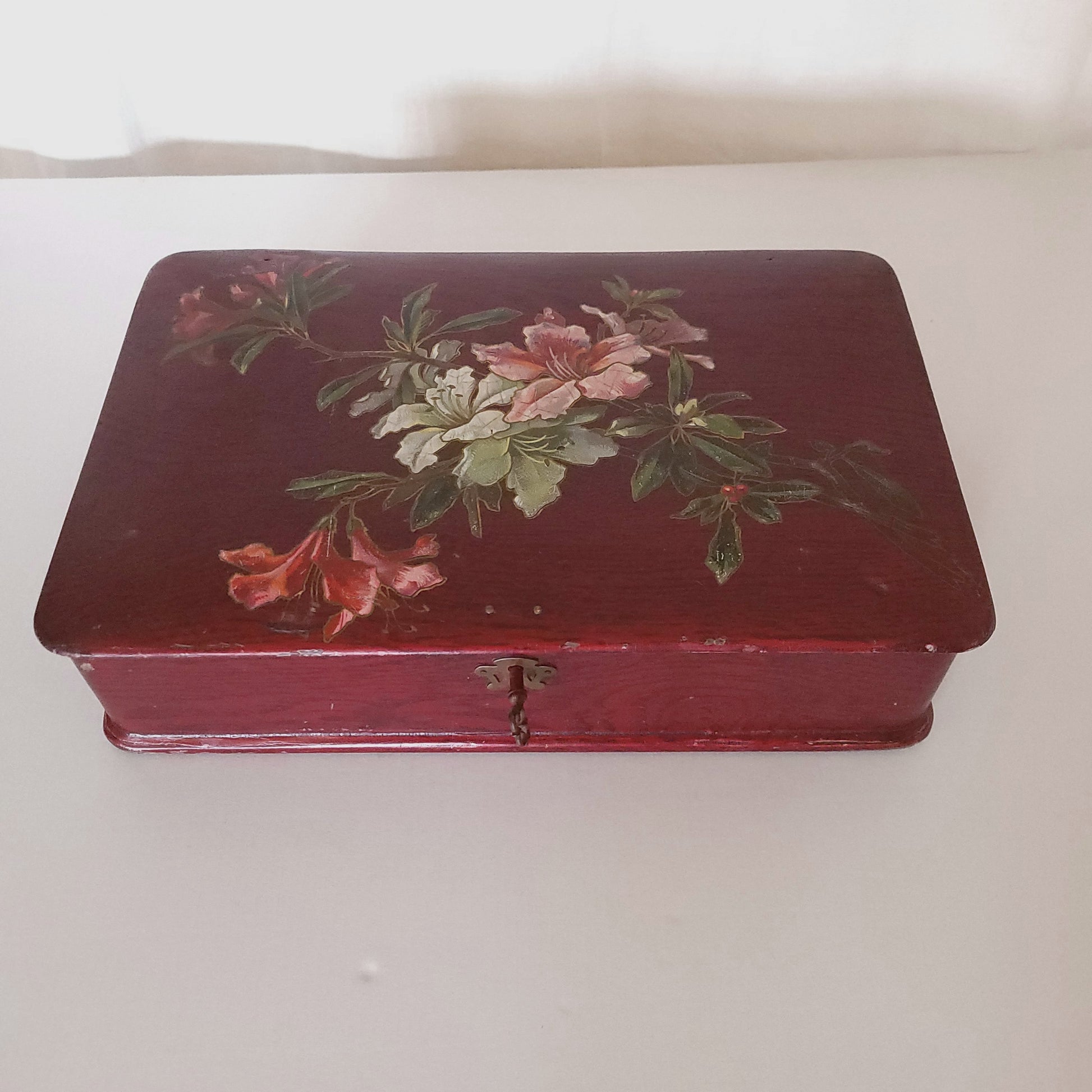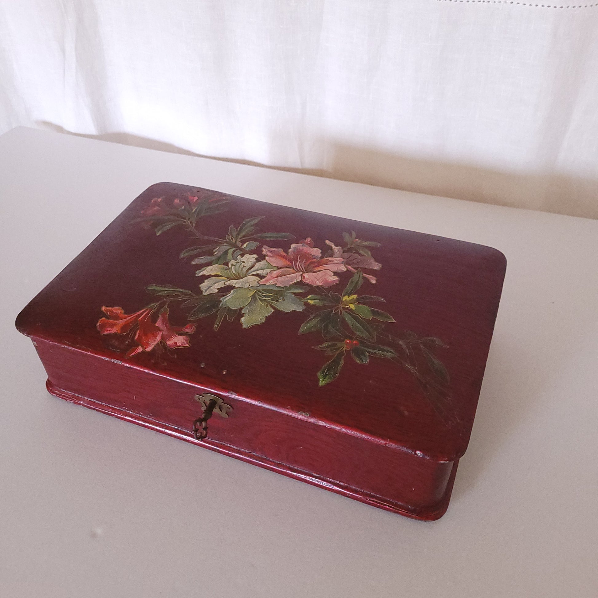 Boîte en bois Art nouveau au décor floral peint à la main, accompagnée de sa clé pour un rangement élégant et sécurisé.