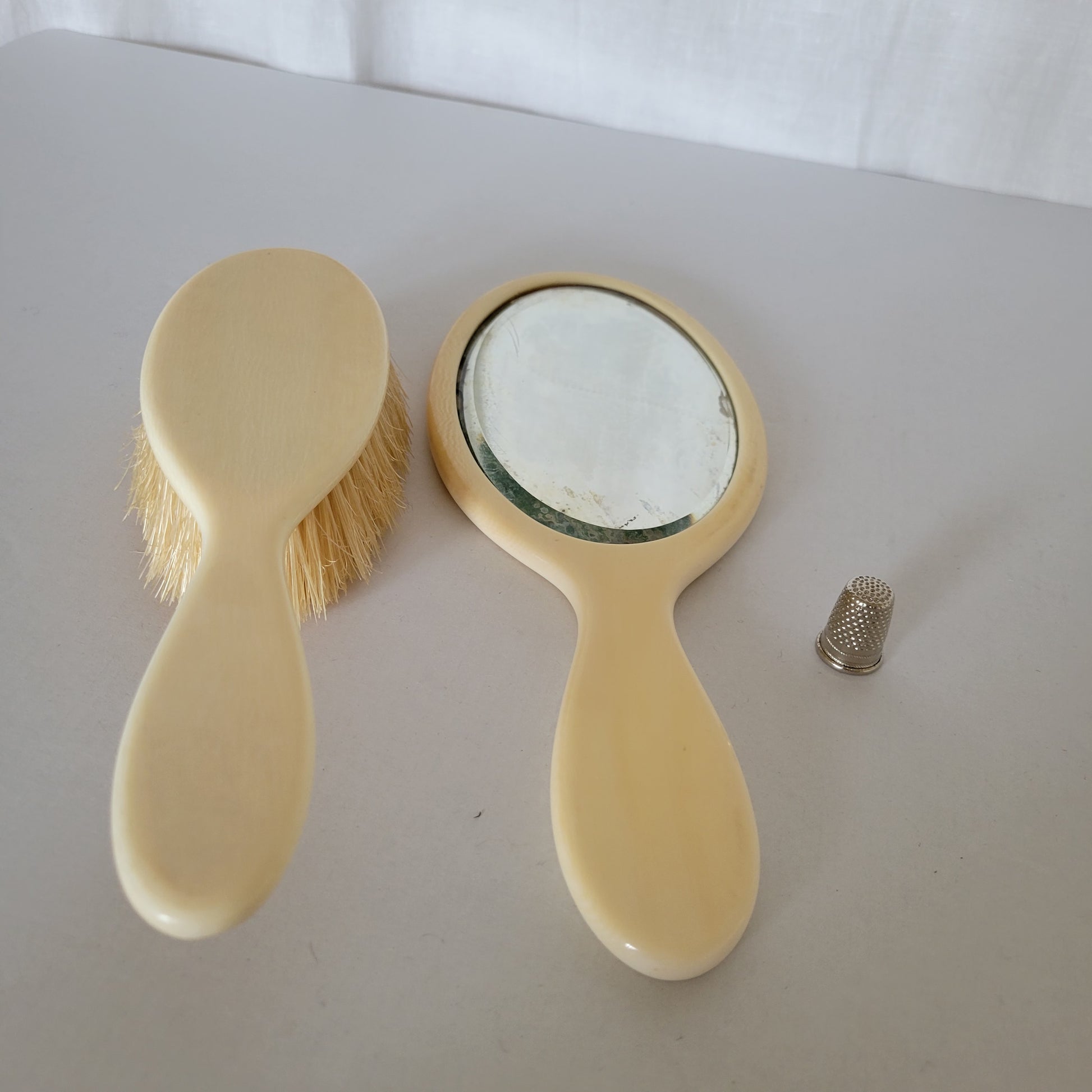 Cette brosse en poil naturel et ce miroir, en ivoire, datent de l'époque Art déco.