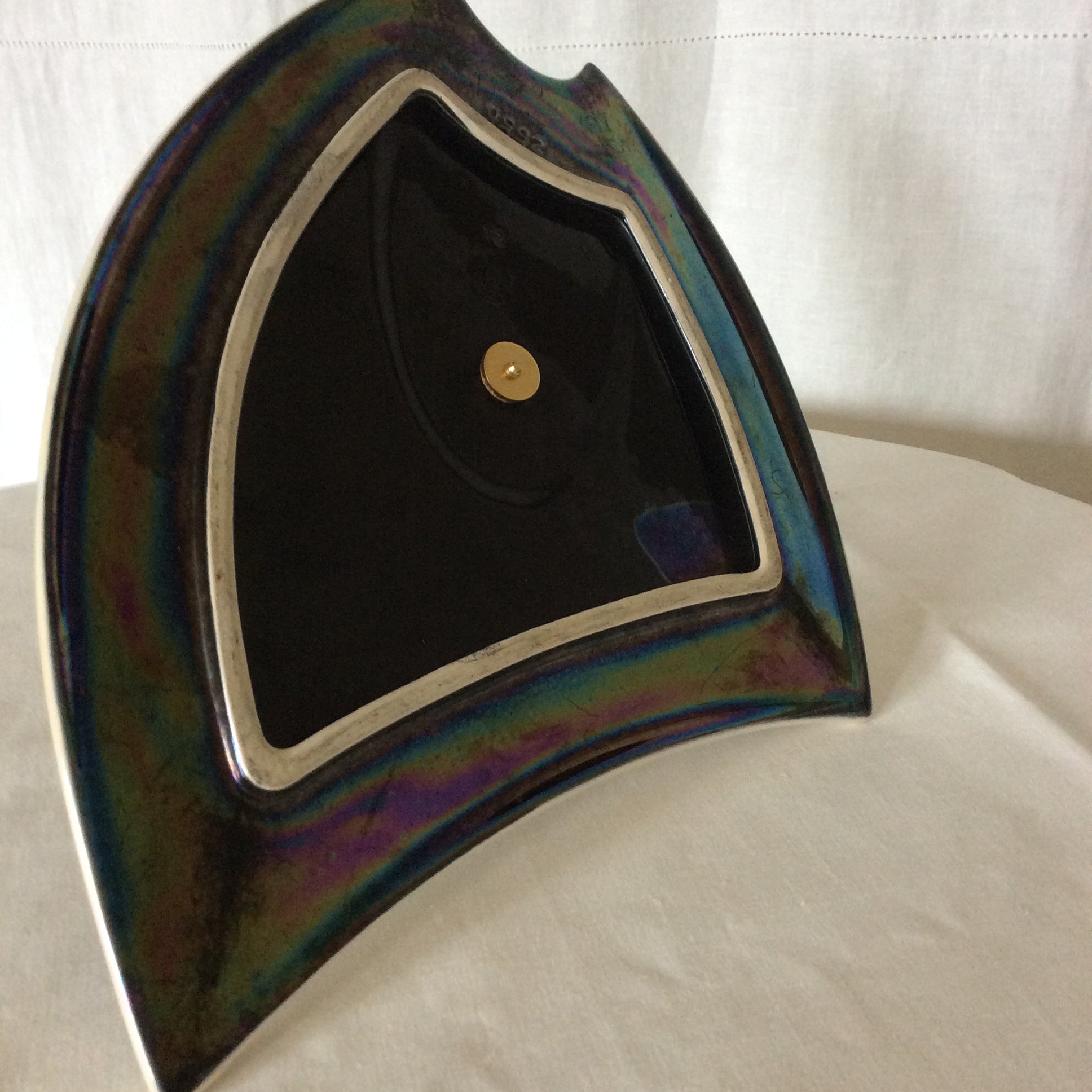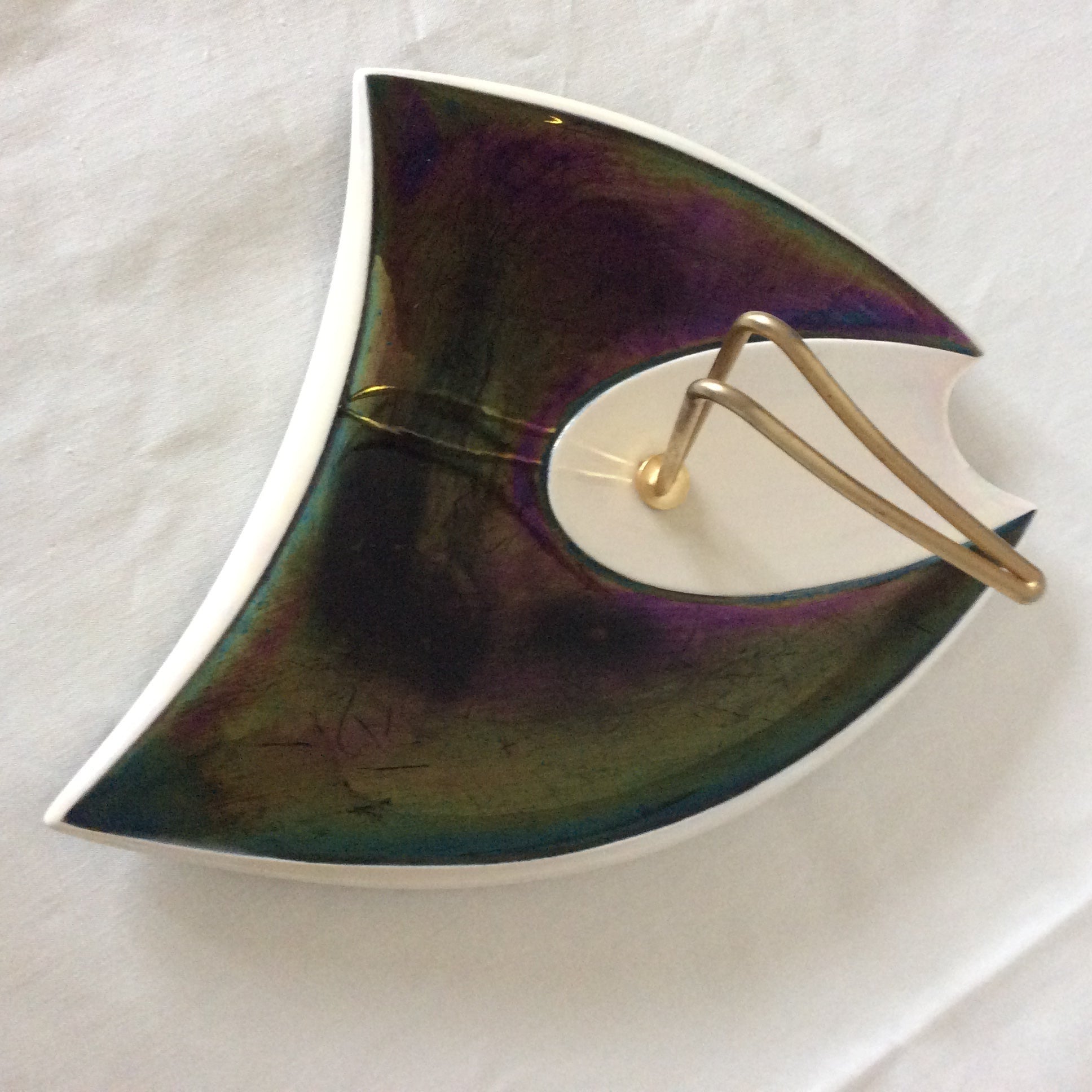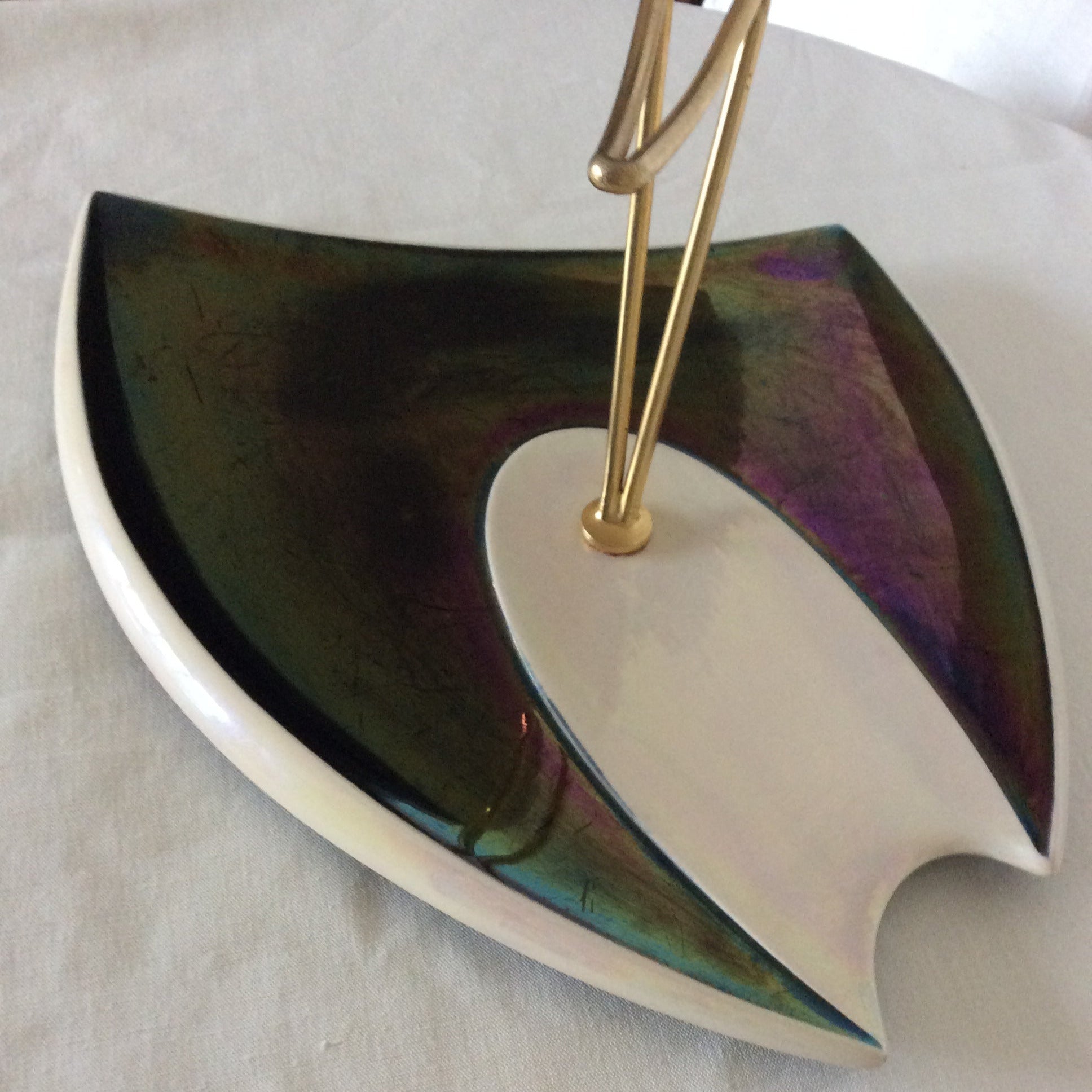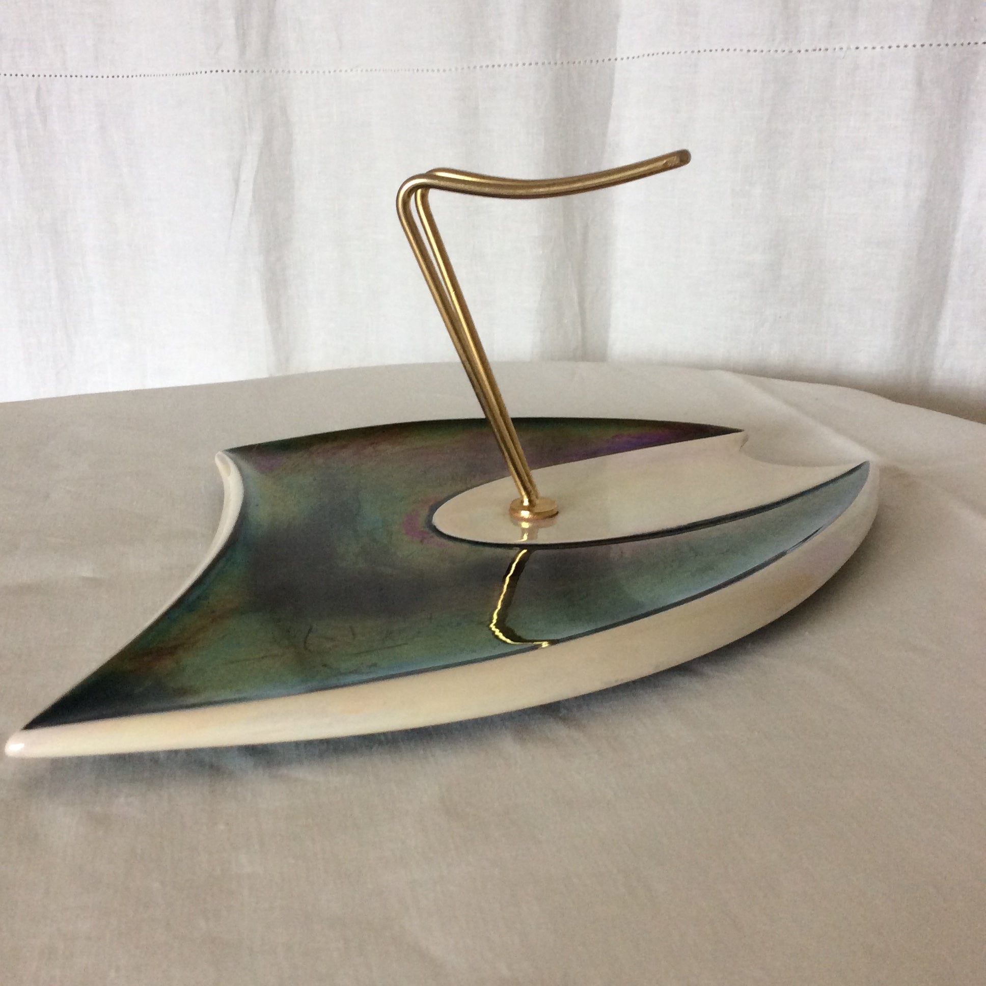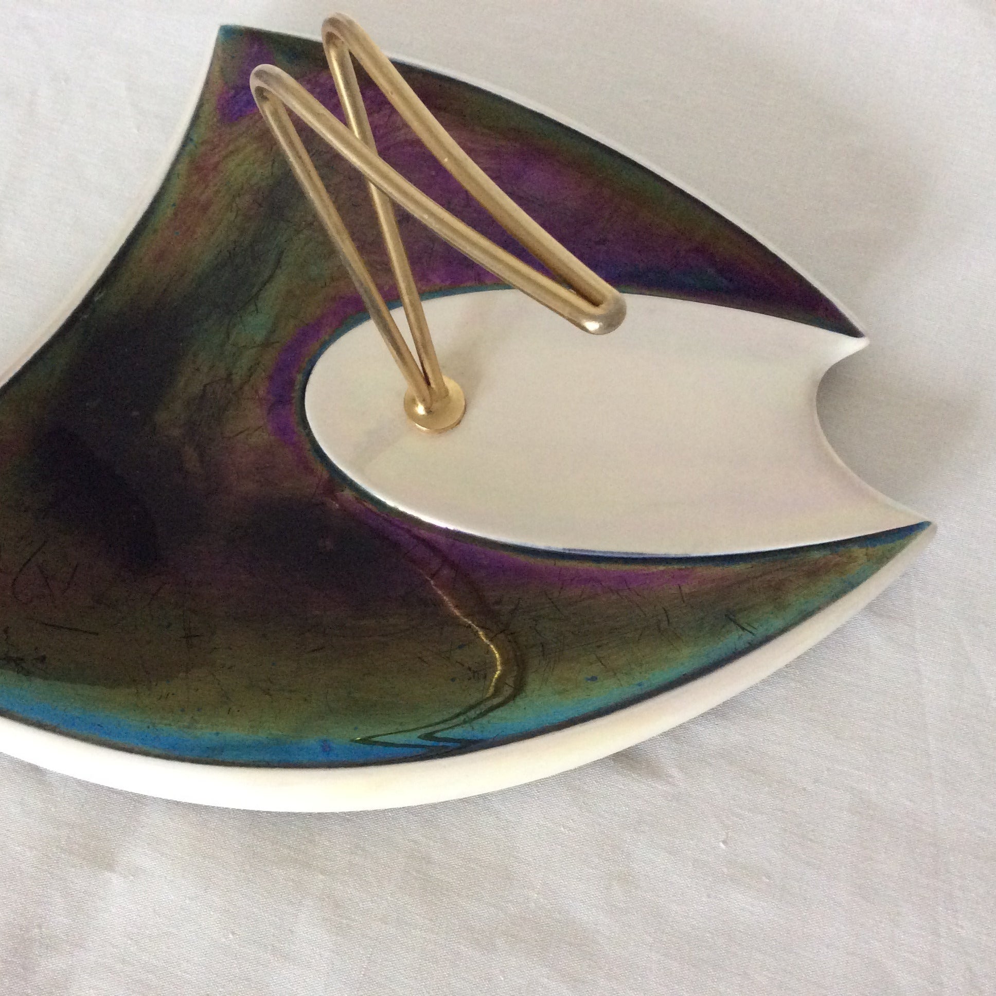Composée d’un plateau en céramique à la forme libre et à l’émail métallisé, complété d’une poignée en laiton.