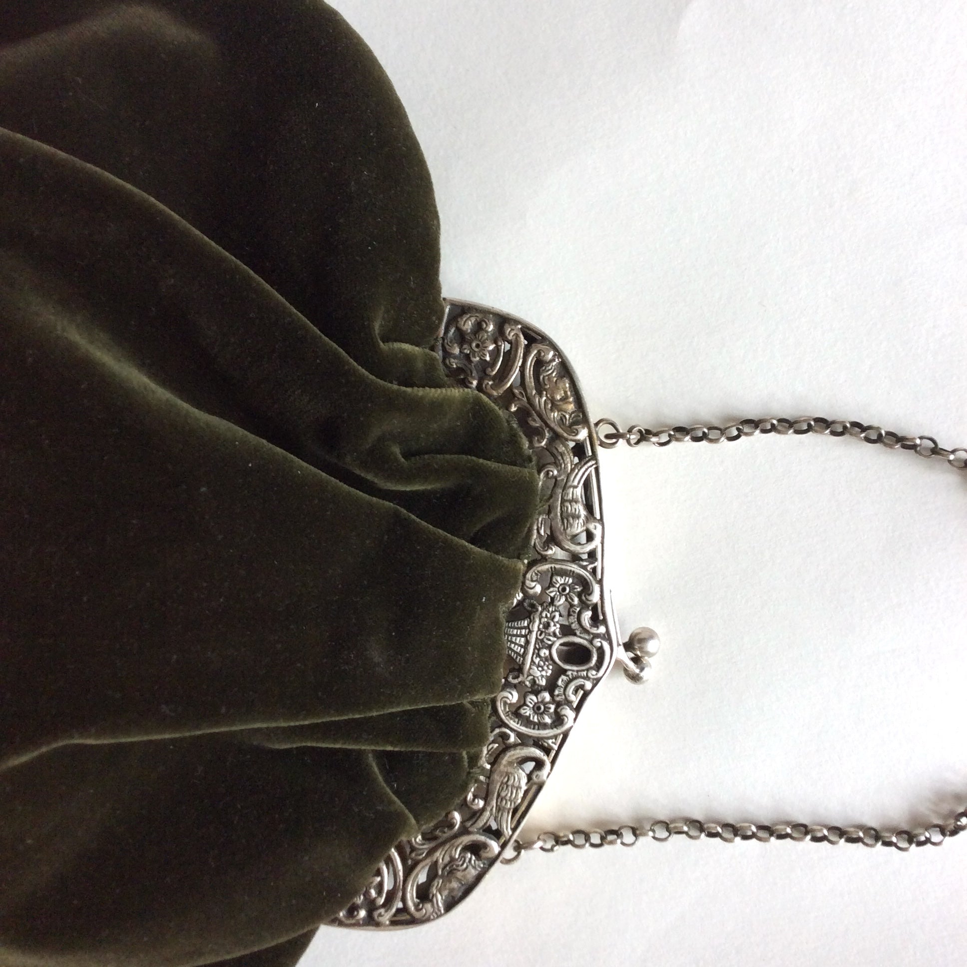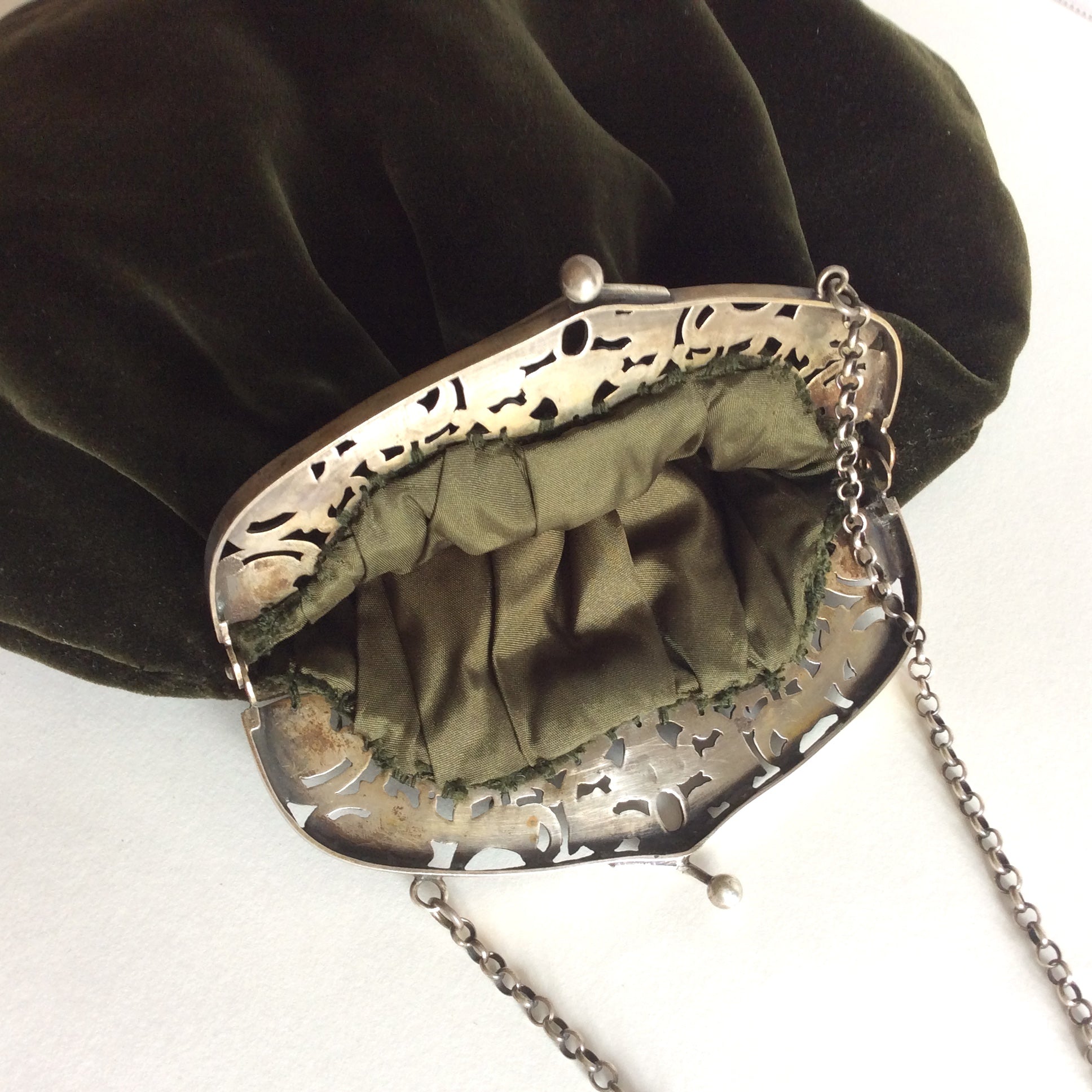 Ce sac en velours vert avec monture argentée, datant des années 40, allie élégance vintage et charme intemporel.