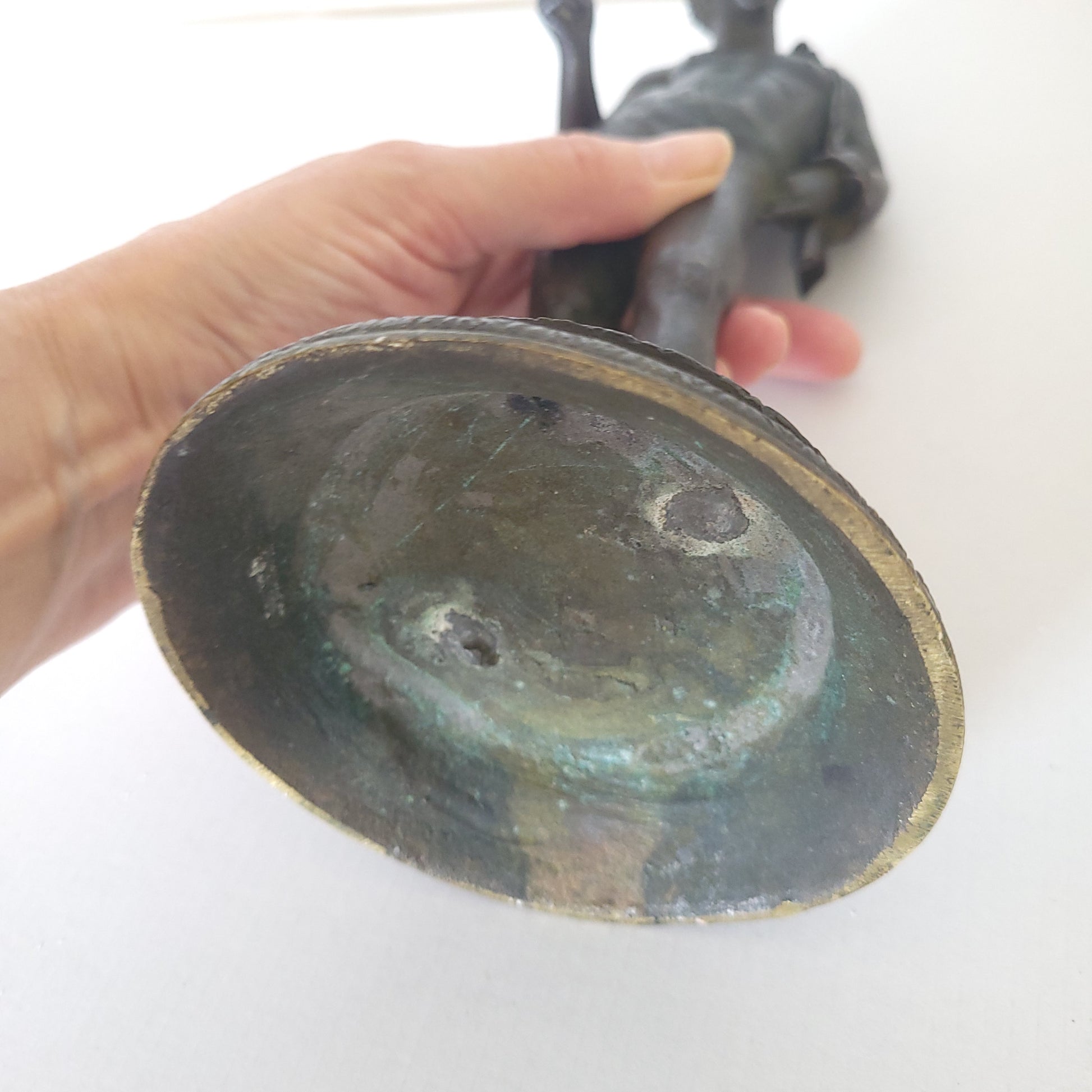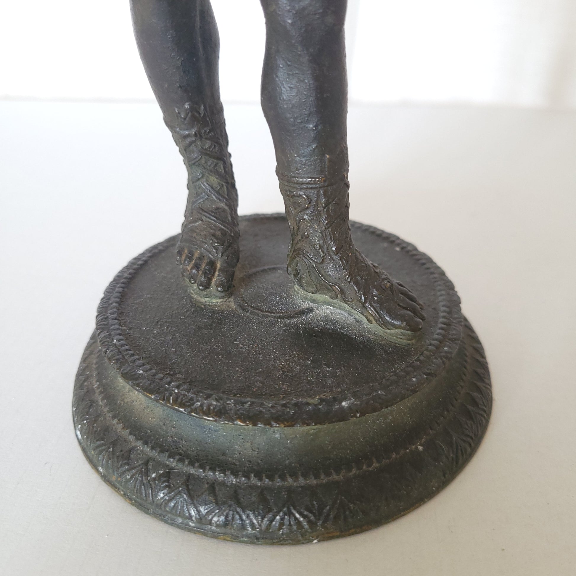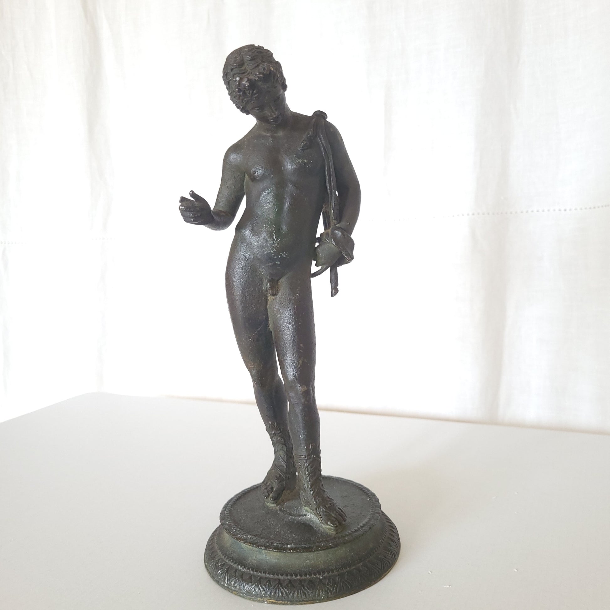 Sculpture en bronze patiné de Narcisse, d'après la sculpture originale exhumée en 1862 à Pompéi et exposée au musée de Naples. La figure en bronze patiné, d'un homme nu élancé, debout et à l'écoute.
